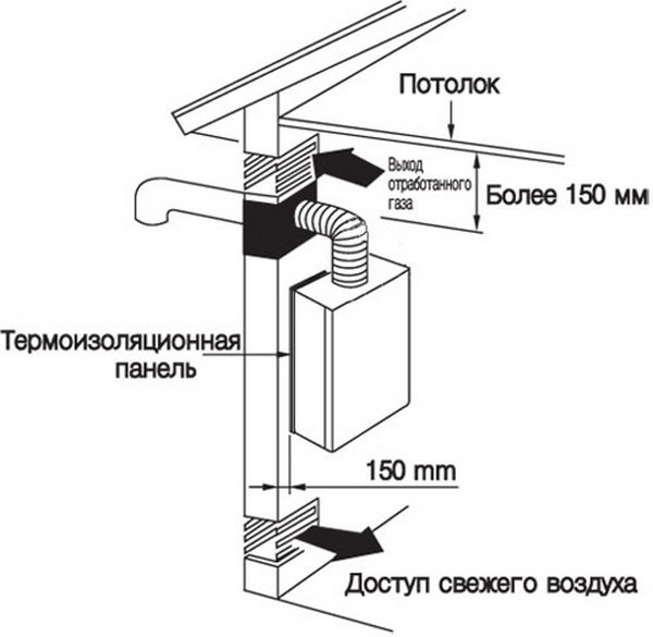 Les unités équipées d'un foyer fermé peuvent être placées non seulement dans une maison privée, mais également dans un appartement d'un immeuble à plusieurs étages. L'évacuation des fumées et l'afflux des masses d'air s'effectuent par un tuyau coaxial qui sort à travers le mur. Les appareils turbocompressés ne nécessitent pas de chaufferie séparée. Ils sont généralement installés dans la cuisine, la salle de bain ou le couloir.