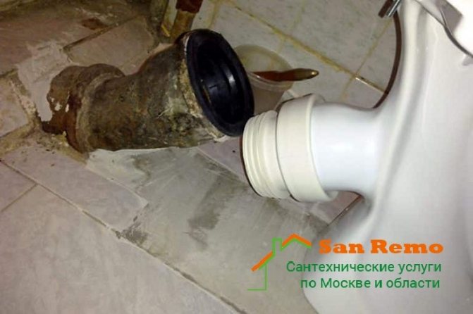 Mais si nous parlons d'une vieille maison, alors, très probablement, un tuyau en fonte y a été installé de la cuvette des toilettes à l'égout. Et généralement, la sortie des toilettes était étroitement intégrée à la fonte, cela se faisait à l'aide de mortier de ciment.