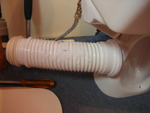 Installez le tuyau et traitez à nouveau avec du mastic, vérifiez l'étanchéité des joints avec de l'eau. Vous pouvez simplement coller l'ondulation sur les toilettes, mais son démontage ultérieur sera alors impossible sans dommage.