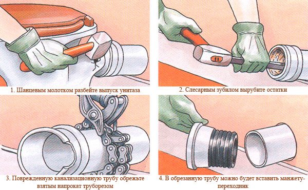 Donc, nous avons un genou en fonte dans lequel les toilettes sont cimentées. Nous prenons un marteau et cassons simplement les sanitaires au niveau du tuyau. Avant de faire cela, assurez-vous de mettre des lunettes de sécurité afin que les fragments ne pénètrent pas dans vos yeux.