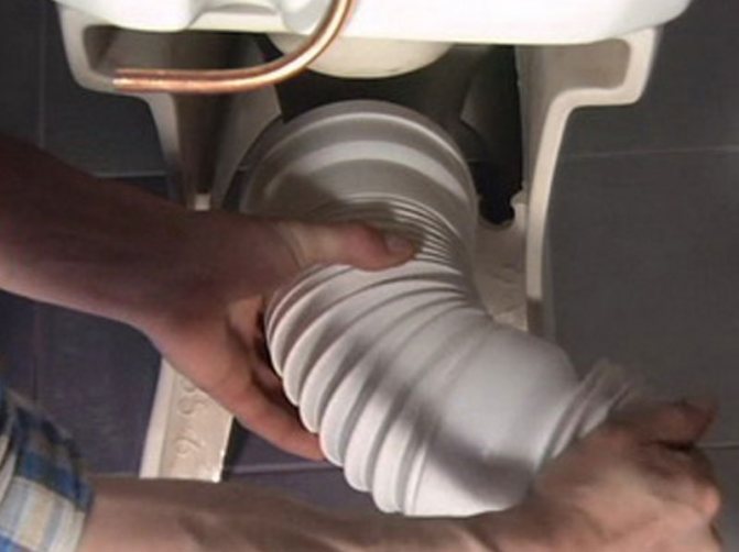 Un nouveau tuyau est inséré dans la douille, comprimé, tiré sur la sortie de la cuvette des toilettes. Tout cela peut être fait avec une ondulation étirée. S'il est extrêmement compressé, rien ne fonctionnera. C'est une nuance qui doit être prise en compte même lors de l'installation initiale.