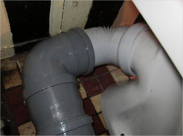 S'il est nécessaire de déplacer le centre de la sortie par rapport à la prise du système d'égout, une ondulation ou un coin avec un tuyau court doit être utilisé pour connecter les éléments.La plomberie est reliée à l'égout à l'aide d'un manchon en caoutchouc, ce qui vous permet de terminer les travaux assez rapidement.