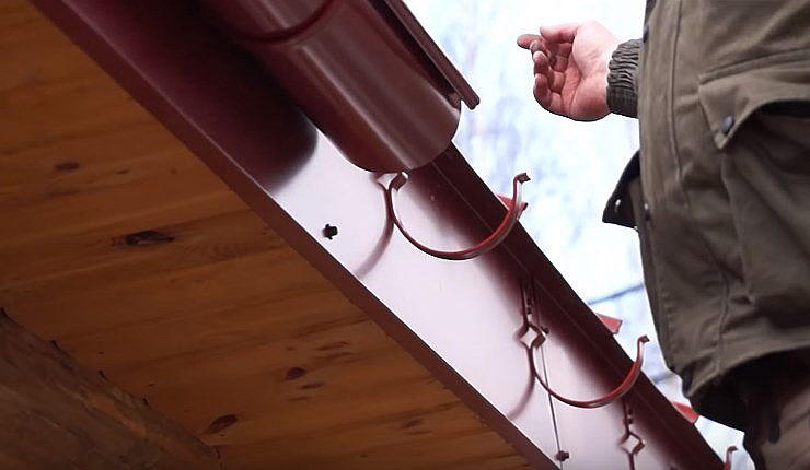 1. Les gouttières sont installées à l'aide de supports, ou en d'autres termes, de supports. L'installation est effectuée sur les chevrons ou le panneau frontal. Dans le cas où les supports de fixation de la gouttière sont en métal, ils peuvent être fixés directement dans le mur de briques.Les supports modernes sont réglables, il n'est donc pas difficile de créer la pente naturelle nécessaire pour l'écoulement de l'eau.
