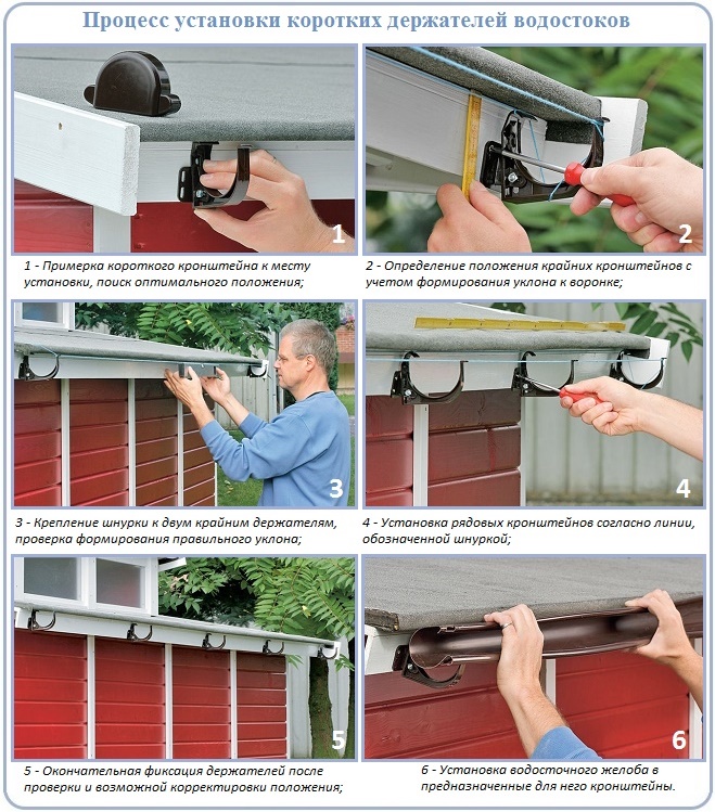 Après l'achat, vous pouvez procéder directement aux travaux d'installation. Tout d'abord, les supports sont fixés à une distance d'un demi-mètre les uns des autres (pour une gouttière en plastique), pour les produits métalliques, ce paramètre peut atteindre un mètre et demi. Ils sont fixés dans la partie frontale du toit, et s'il n'y en a pas, les pieds du chevron s'adapteront. Tout d'abord, les éléments extrêmes sont installés, après quoi la ficelle est tirée entre eux et, en se concentrant dessus, intermédiaire