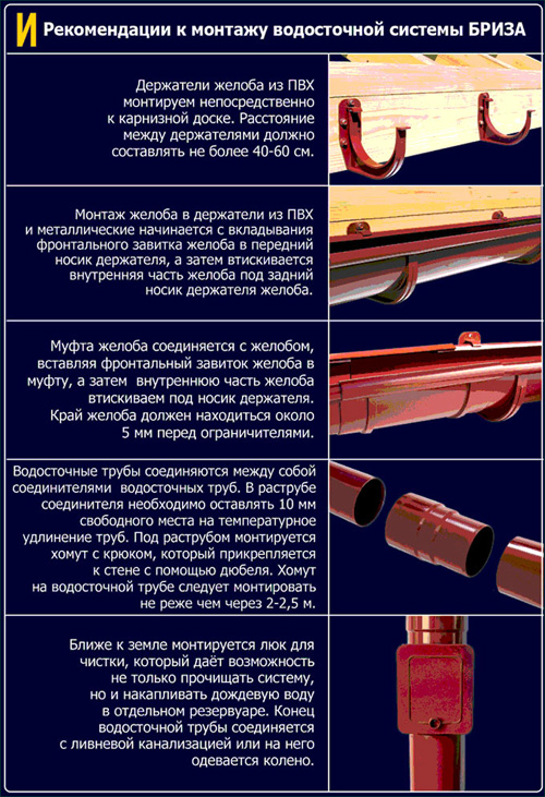L'eau collectée sur le toit est dirigée par un tuyau de drainage le long d'une gouttière spéciale dans un égout ou une gouttière. L'installation commence par le marquage et la fixation solide des supports.