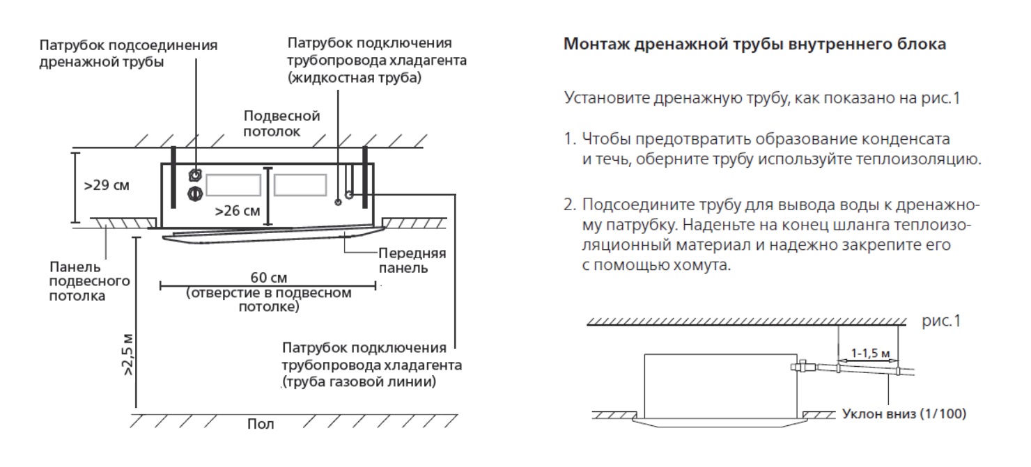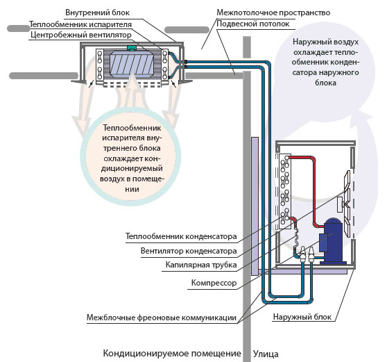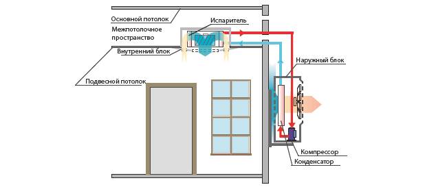 • Système de fréon caché. Tous les tuyaux, ainsi que le drainage, sont cachés sous un faux plafond. Pour eux, vous n'avez pas besoin de fabriquer des stroboscopes, puis de les fermer avec du mastic et du plâtre.