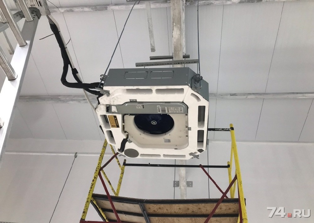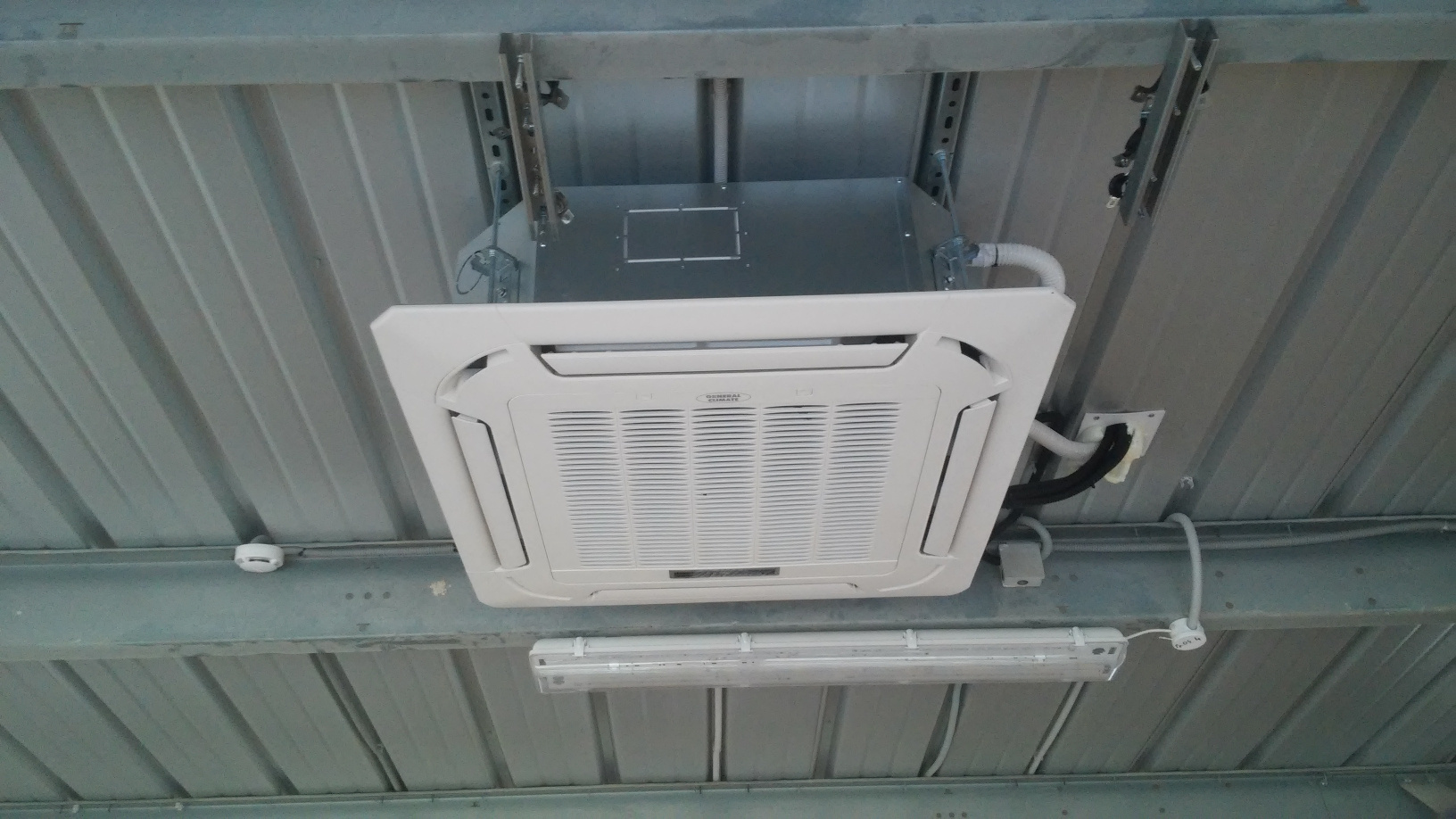 Modules internes d'un système split cassette monté dans un bureau. Dans ce cas, une structure de suspension ouverte sur le cadre est utilisée, constituée de profilés métalliques rectangulaires.
