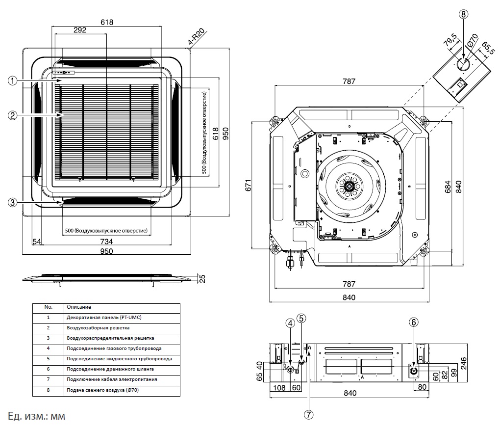 Exécution du module externe : 1 – compresseur frigorifique ; 2 - vanne à quatre voies; 3 - tableau électronique et électrique; 4 - ventilateur de condenseur ; 5 - tubes à ailettes du condenseur ; 6 - filtre-sécheur ; 7 - bloc de robinets d'arrêt; 8 - couverture