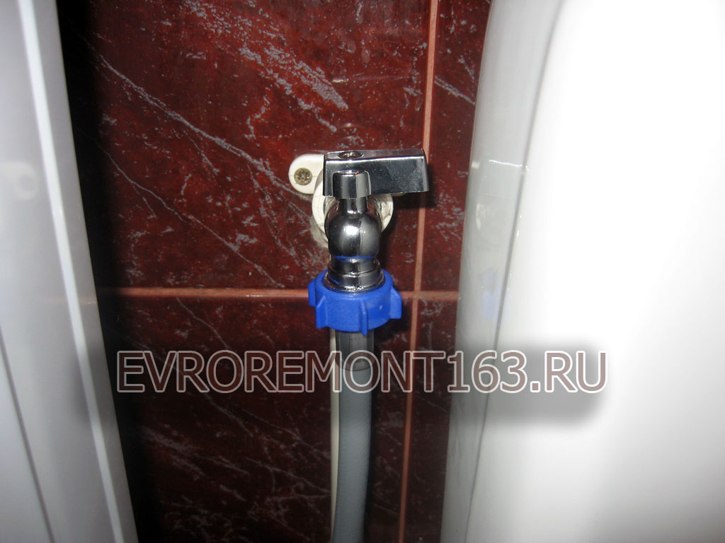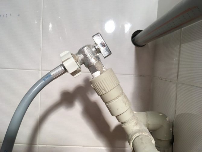 Étape 3. Connectez-vous à l'alimentation en eau. Ils prennent un tuyau d'alimentation en eau, insèrent un filtre d'un côté (généralement il est livré avec un kit), le vissent au raccord sur la paroi arrière de la machine et l'autre extrémité au robinet traversant sur le tuyau d'eauaprès avoir inséré le joint.