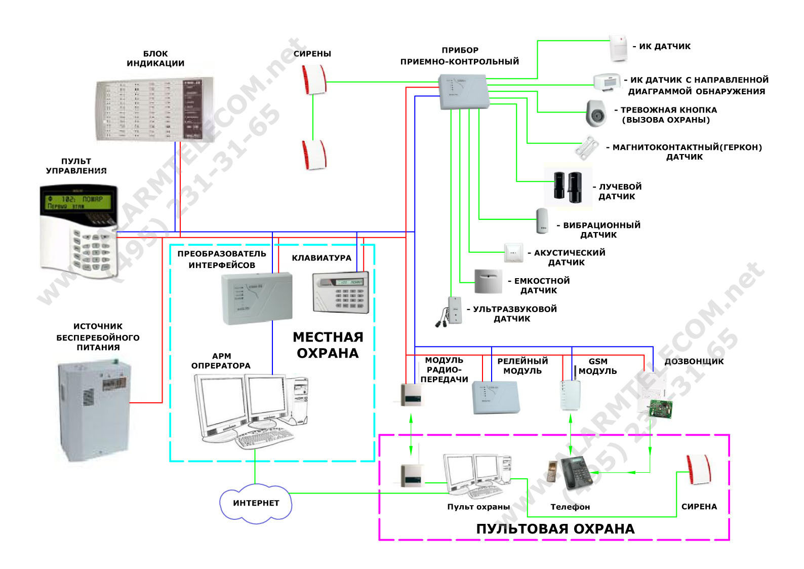 Le système de sécurité de ce type est presque similaire à la sécurité GSM. Elle possède également un ensemble de capteurs appropriés qui surveillent la pénétration de l'objet. Lorsque l'un d'eux se déclenche, une notification est faite via une ligne téléphonique fixe aux numéros programmés dans le module électronique de la centrale.