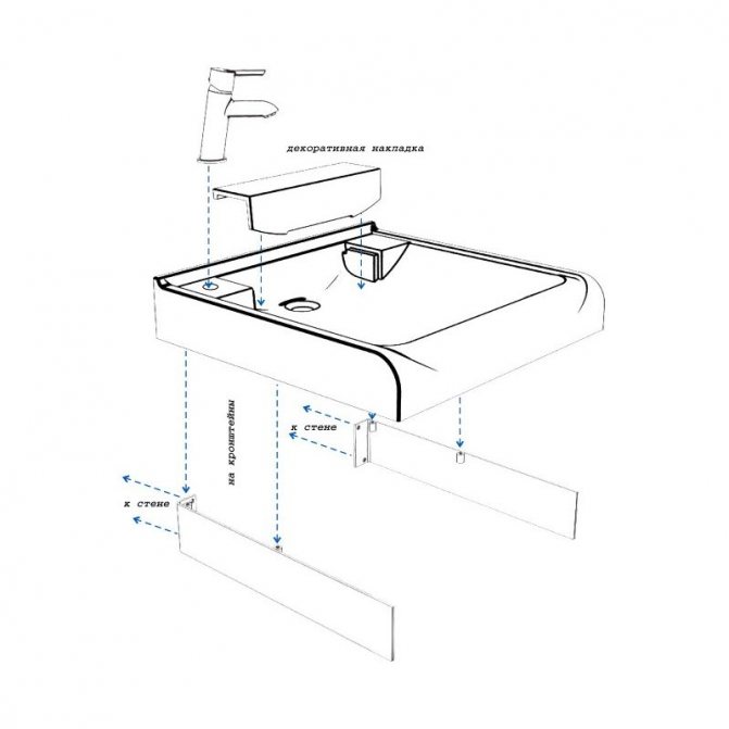 Les supports fournis avec le produit principal sont utilisés comme fixations pour l'évier au-dessus de la machine. Le travail du maître plombier consiste à fixer les supports et à suspendre la cuvette.