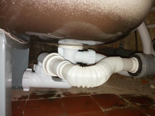 Installation non standard d'un siphon relié à un trou de vidange avec un tuyau annelé :