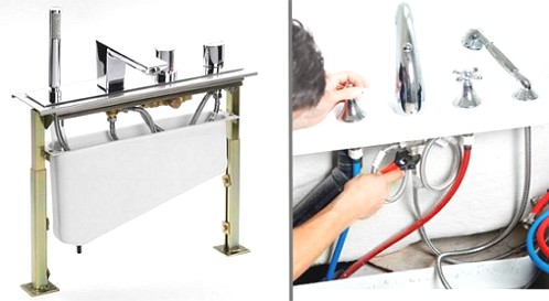 Considérons maintenant une autre option pour installer le mélangeur - sur une surface horizontale. Un tel besoin se pose lors de l'installation du mélangeur à bord de la baignoire. Avant de se lancer dans une telle installation, il est impératif de préciser si le côté porteur du côté de la planche peut supporter la charge accrue. Pour monter ce type de mélangeur, vous aurez besoin d'une perceuse avec un ensemble de fraises, de clés et de tournevis.