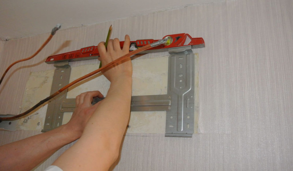 La plaque est appliquée au mur, nivelée et les endroits où les fixations seront placées sont marqués.