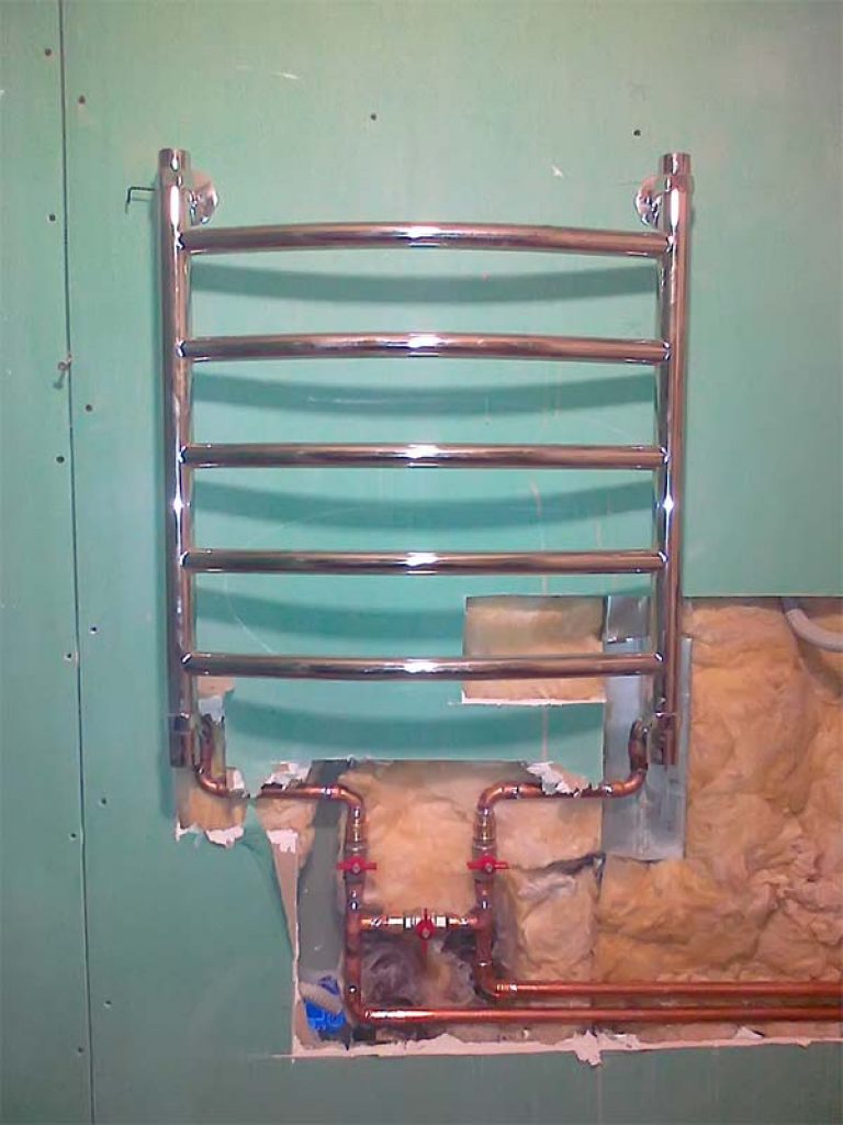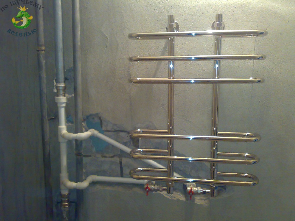 Il convient de noter que l'entrée d'eau du sèche-serviettes doit être en haut et la sortie en bas, car l'eau traverse l'appareil de haut en bas. Souvent, lors de la connexion d'un sèche-serviettes à une colonne montante dans la salle de bain, il est nécessaire de changer partiellement ou complètement la colonne montante. Pour ce faire, les tuyaux doivent être connectés les uns aux autres.