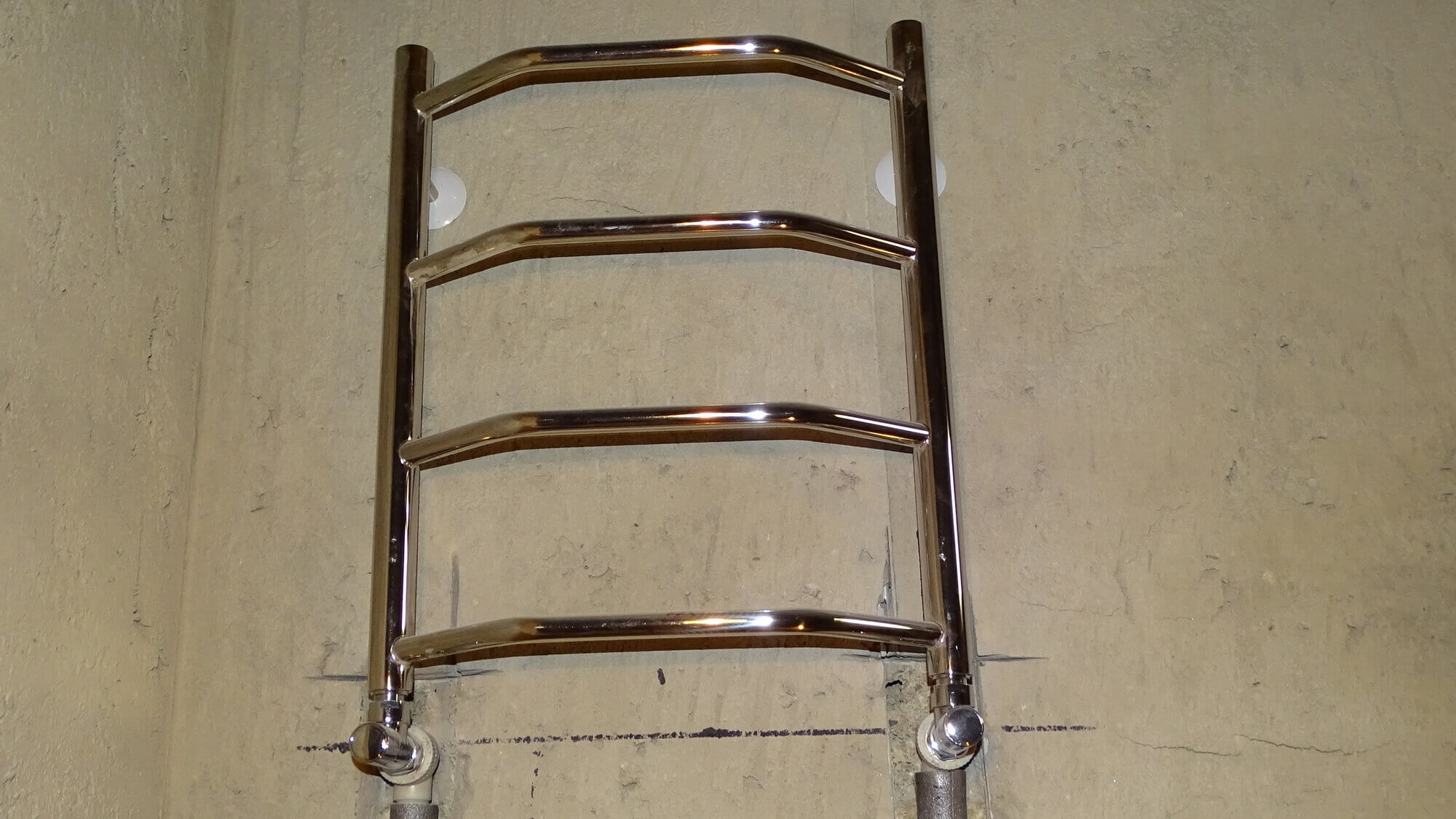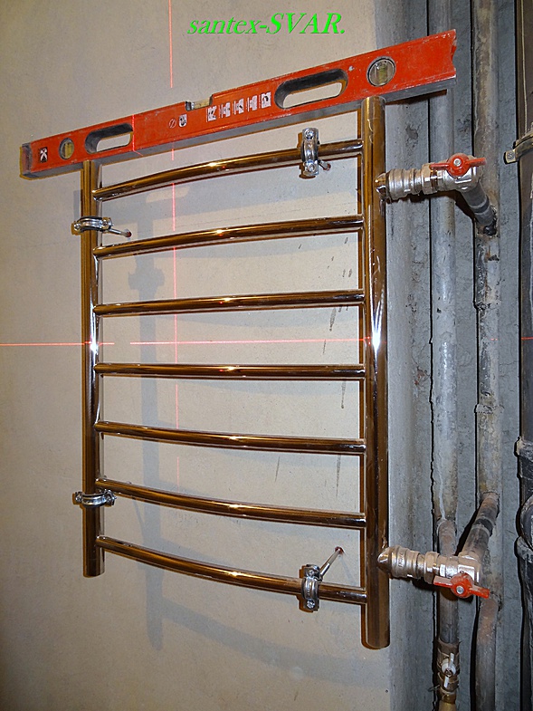 Avant l'installation, des fixations sont placées sur les tuyaux du sèche-serviettes, qui sont ensuite vissés au mur avec des vis. Dans ce cas, il est recommandé d'utiliser des équerres, car ces dernières permettent, après installation, d'ajuster la position de la batterie en fonction du niveau et par rapport aux tuyaux d'alimentation et au mur.