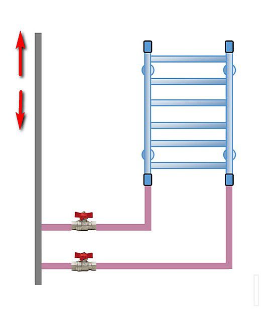 Les robinets peuvent être positionnés de manière à ce que le flux d'eau soit dirigé à travers le sèche-serviettes ou en le contournant. Cette dernière option aidera à éviter de l'obstruer avec de la rouille ou du sable en cas d'interruption de l'alimentation en eau chaude pour un entretien programmé. Cela facilitera également la tâche. pour réparation ou remplacement conception dépassée. La colonne montante dans ce cas remplace le cavalier. Lorsque la distance à l'eye-liner est inférieure à un demi-mètre, il peut être positionné horizontalement. Sinon, une légère pente doit être faite, environ 1 cm.