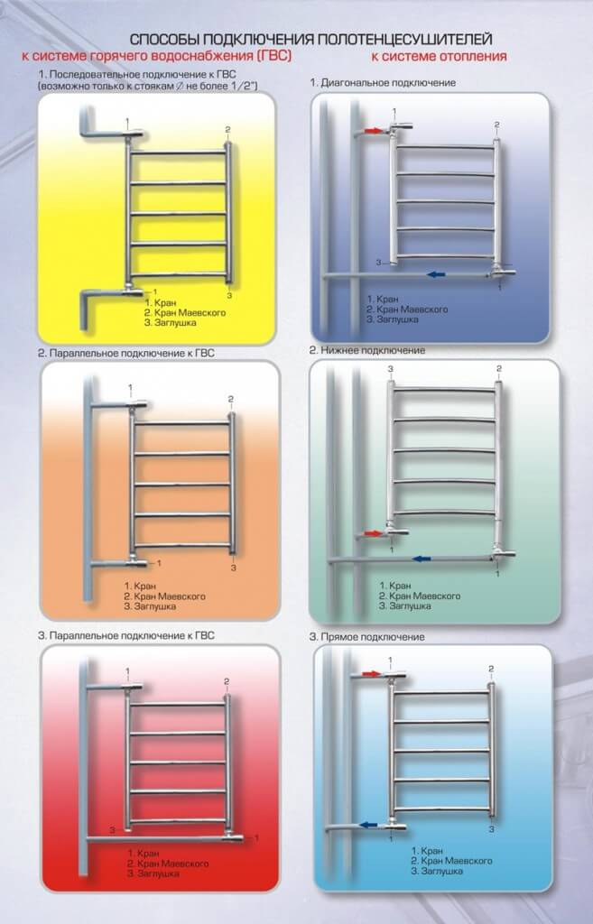 Il existe deux façons de connecter un sèche-serviettes à eau à une colonne montante. Si vous avez une colonne montante avec de l'eau chaude, le porte-serviettes chauffant s'y écrase. Plus rarement, un sèche-serviettes est relié au système de chauffage, mais cela n'est pas conseillé, car dans ce cas l'appareil ne sera chaud que pendant la saison de chauffage, et le reste du temps il ne sera d'aucune utilité, sauf comme cintre. Les sèche-serviettes sont électriques et à eau. L'article parlera de ceux à eau, car les électriques ne nécessitent pas de raccordement à la colonne montante et sont installés comme un chauffage au sol, alimentés par le secteur.