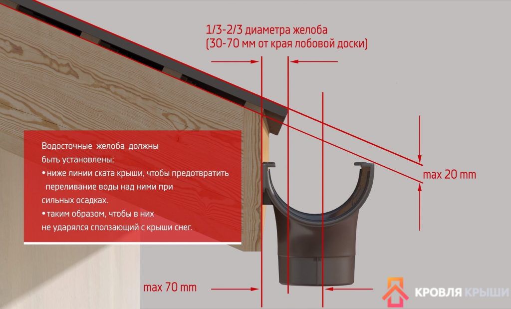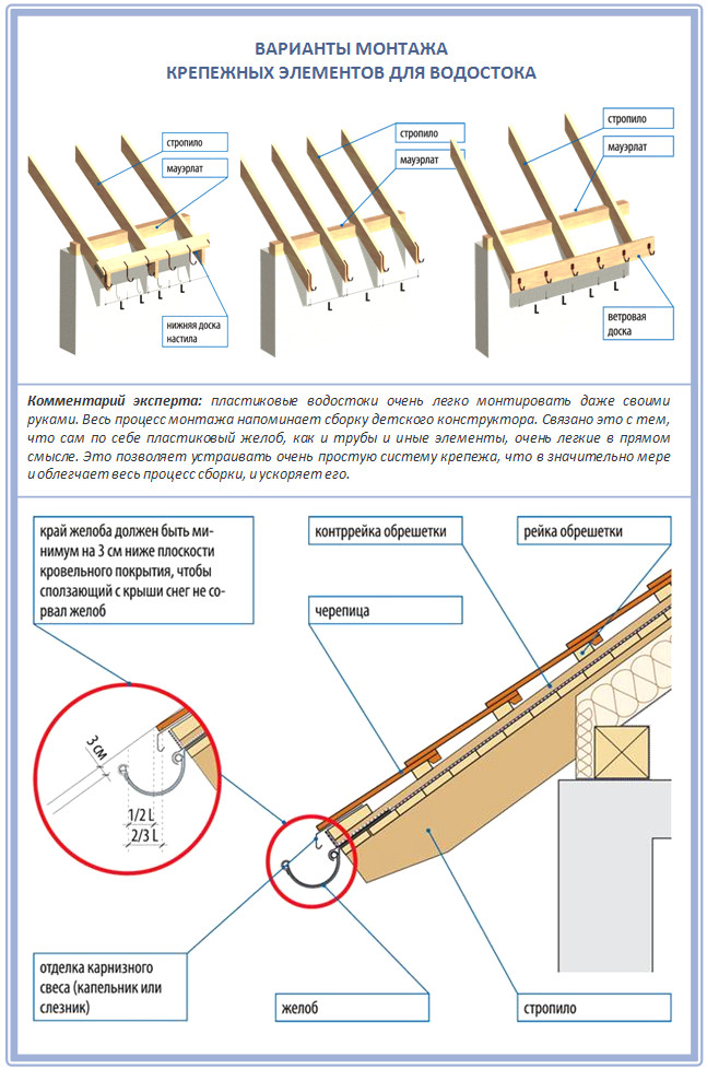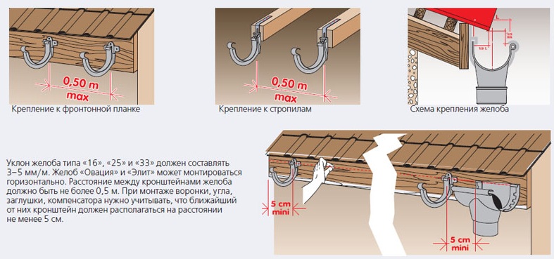 Le marché offre de nombreuses solutions en termes de fixations pouvant être utilisées pour installer des gouttières. Dans le même temps, l'installation de ces composants du système de drainage est effectuée à la fois sur le mur et directement sur le toit. En même temps, la condition suivante doit être respectée : les gouttières doivent être installées de manière à ce qu'il y ait une pente d'environ 5 cm par 10 mètres de longueur de ce produit en direction du tuyau de descente. Cette position assure un écoulement libre de l'eau sans déborder sur les bords de la gouttière. Si la longueur de la maison dépasse 20 mètres, il est nécessaire d'aménager 2 pentes pour le drainage complet de l'eau, en partant du milieu du bâtiment.