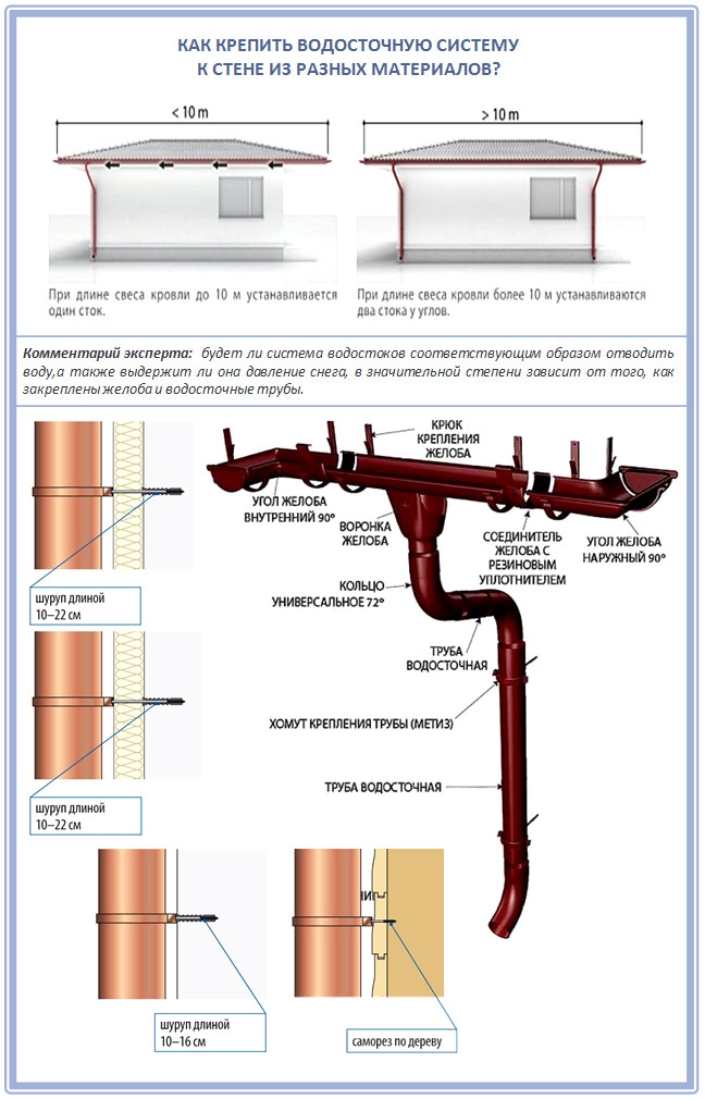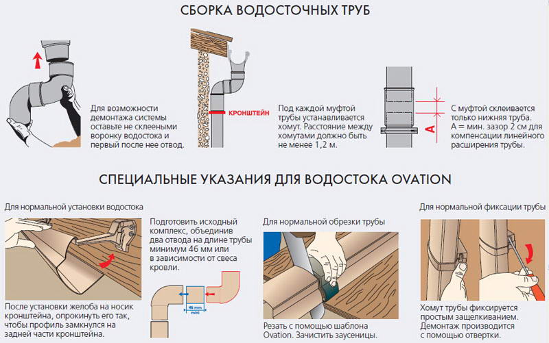 Les gouttières sont situées sous le surplomb du toit. Ils sont montés sur des supports spéciaux qui maintiennent le système. Étant donné que le collecteur d'eaux pluviales est situé sur tout le périmètre du toit, il existe des coins - internes et externes. Tous ces éléments doivent être connectés de manière étanche, pour cela il existe des connecteurs de gouttière avec des joints en caoutchouc. Ces éléments sont souvent considérés comme redondants. Ensuite, les gouttières se chevauchent avec un chevauchement d'au moins 30 cm, reliées par des vis autotaraudeuses.