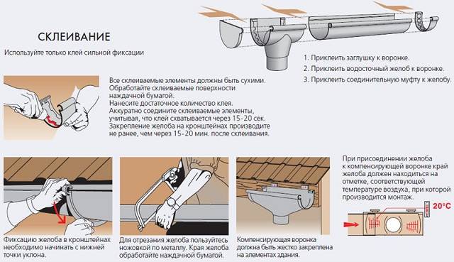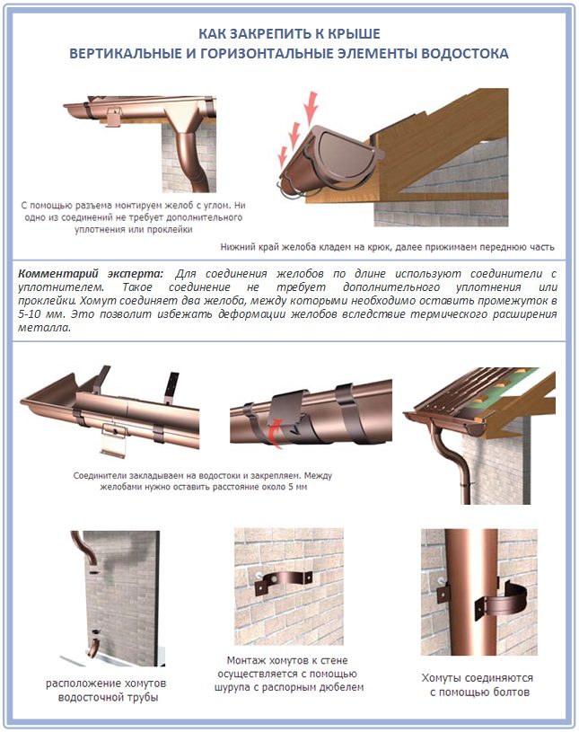 Lors de l'installation de tout système de gouttière, il est extrêmement important de prendre en compte le mouvement thermique de la gouttière et de ses éléments structurels qui, selon le matériau de fabrication, fonctionnent différemment en tension et en contraction. Selon les règles, le seul élément mobile de ce type doit être une plainte articulée, qui est montée sans collage supplémentaire - uniquement sur un loquet