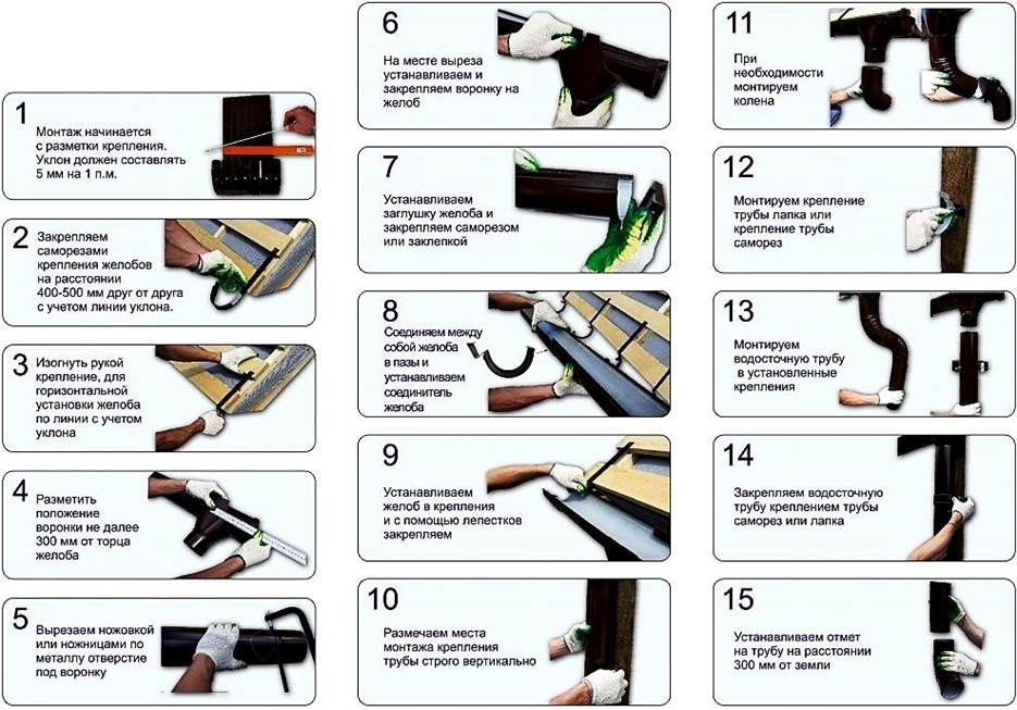 Il ne reste plus qu'à poser et fixer les gouttières aux attaches. L'essentiel est que la pose soit effectuée avec un chevauchement des bords des plateaux, c'est-à-dire lorsque le bord du plateau supérieur est posé sur le bord de la gouttière inférieure. De cette façon, les problèmes de fuites au niveau des joints sont résolus. Pour réduire les risques de fuites, les joints sont traités avec du mastic silicone.