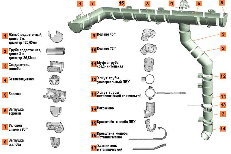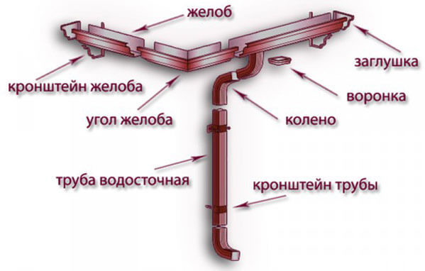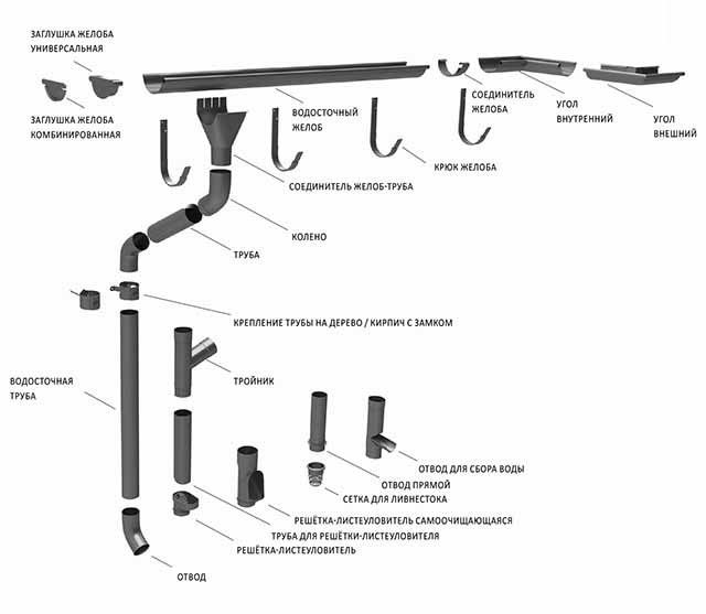 A partir de tous ces éléments, un système de la configuration requise est assemblé. Si vous décidez d'acheter des éléments prêts à l'emploi, puis d'assembler la gouttière de vos propres mains, la meilleure solution est d'avoir un plan de maison avec des dimensions à portée de main.Selon celui-ci, vous déterminerez rapidement la composition du système et calculerez le nombre d'éléments requis.