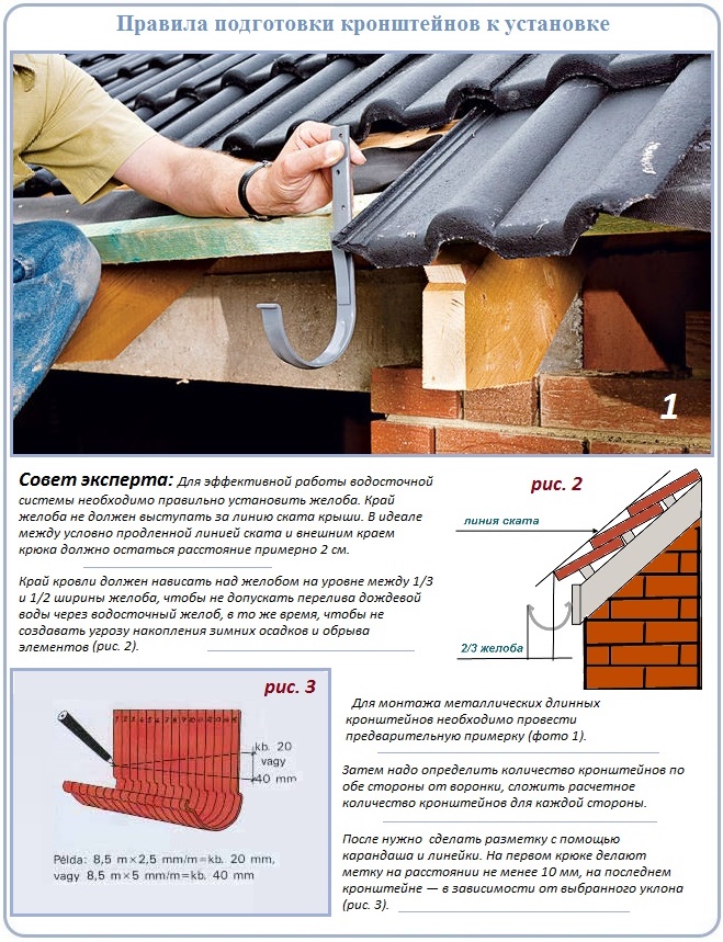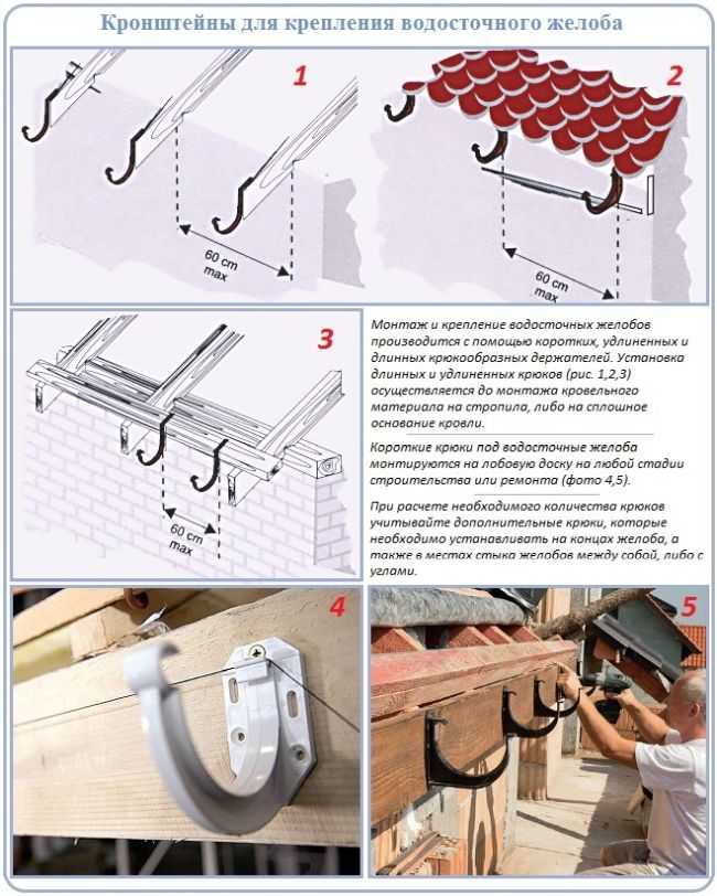 La fixation fiable des gouttières est assurée par des supports installés par incréments d'un demi-mètre. Dans le même temps, il convient de veiller à ce que ce paramètre soit respecté quelle que soit la distance entre les chevrons, par exemple, vous pouvez utiliser la caisse pour le montage de ces fixations.