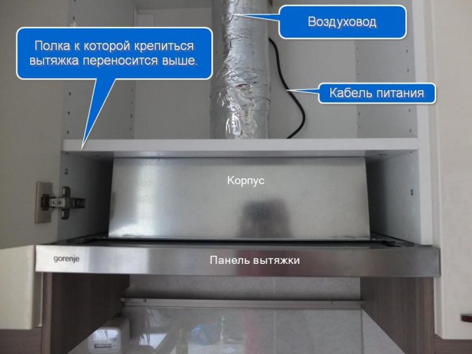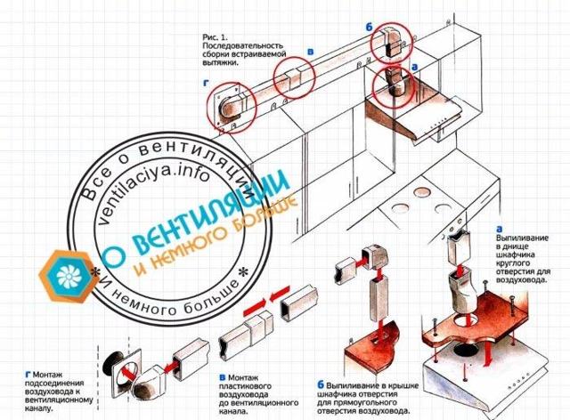Bien entendu, l'installation d'une hotte de cuisine de vos propres mains dépend de son type et de l'emplacement de la gaine de ventilation. Dans un premier temps, nous considérerons l'installation en prenant l'exemple d'un appareil encastré dans une armoire.