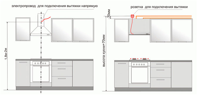 Il est interdit d'installer des prises près du poêle et près de l'évier, la meilleure option serait donc d'installer une prise pour la hotte au-dessus des armoires murales, à une hauteur d'environ deux mètres.