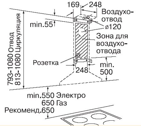Déplacez la sortie vers la droite ou vers la gauche du centre de la hotte.Si vous choisissez un autre endroit plus ouvert, la prise peut être décorée avec une boîte spéciale.Ne cachez pas la prise derrière des armoires suspendues ou des appareils encombrants!