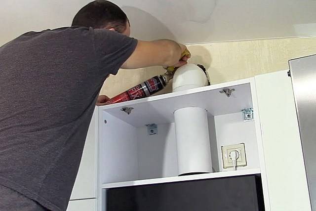 - Pour plus de commodité, installez le boîtier sur une armoire murale au-dessus du poêle. Ensuite, fixez-le plus fermement en scellant toutes les fissures avec de la mousse de montage et en le collant au boîtier pour éviter les résonances.