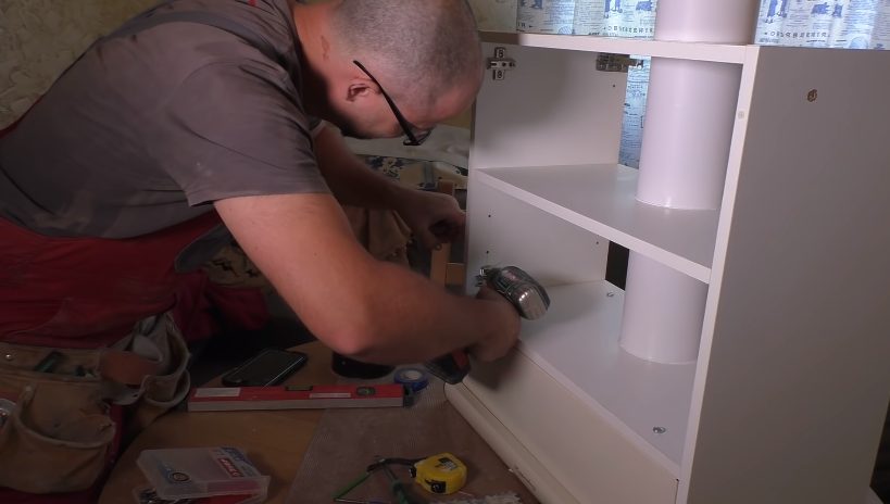 - Au début, essayez simplement le corps du craquelin et faites des marques sur l'armoire pour le trou. Après cela, vous pouvez retirer l'armoire du mur et découper un trou pour le cadre dans le mur inférieur avec une scie sauteuse. Pour ce faire, percez un trou à l'intérieur de la zone de marquage avec une grande perceuse, puis insérez-y une lame de scie sauteuse et commencez à découper la forme dont vous avez besoin dans l'armoire.