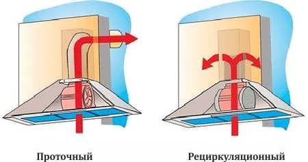 Hotte à flux - elle est reliée par des tuyaux de ventilation à une cheminée ou à un canal traversant les murs jusqu'à la rue. À l'intérieur d'eux sont installés des ventilateurs qui aspirent l'air, le déplaçant avec force dans le système. L'air pollué est rejeté à l'extérieur des locaux selon le chemin spécifié. Il est remplacé par du frais, ce qui signifie que dans la pièce, pour un fonctionnement efficace de l'appareil, un système de ventilation de haute qualité doit être fourni.