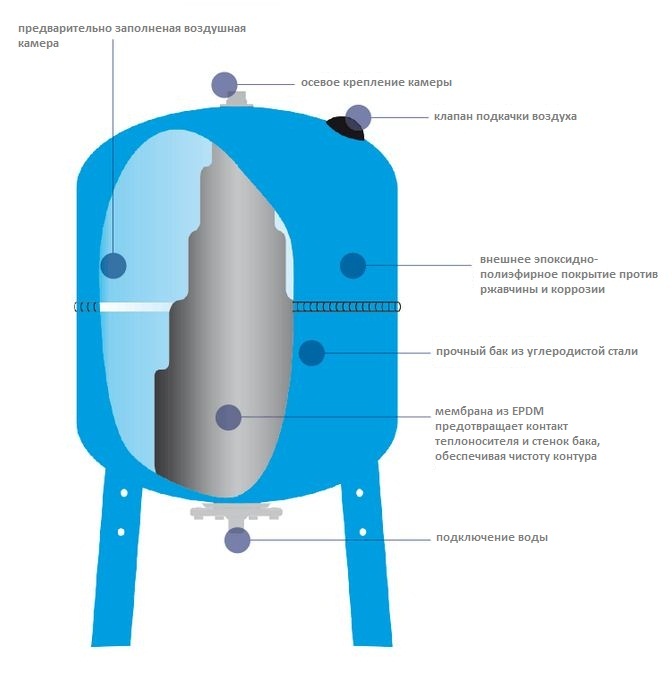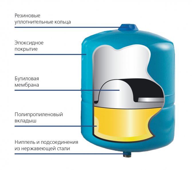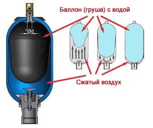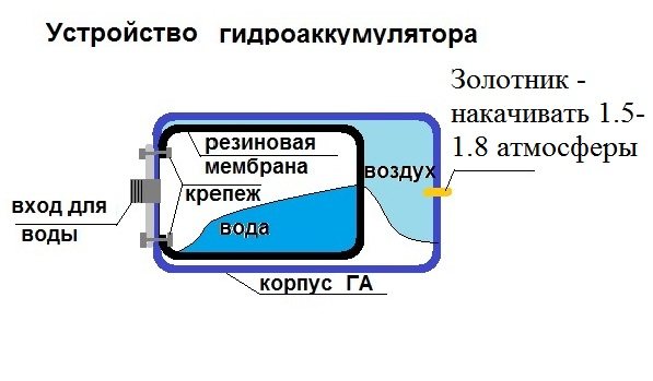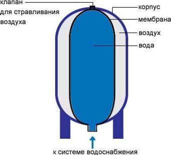 Son schéma de dispositif est assez simple - il y a un réservoir en métal, qui est divisé en deux parties par une membrane en caoutchouc. Il y a de l'eau dans la membrane elle-même et la pression nécessaire est créée par l'air, qui est pompé dans la deuxième partie du réservoir.