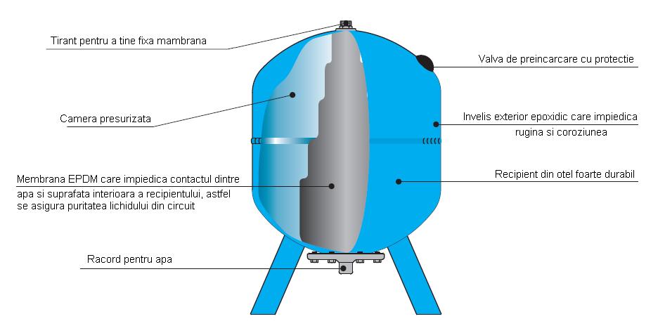 Il est à noter que la capacité du réservoir hydraulique est scellée et divisée en deux chambres à l'aide d'une membrane spéciale, la première est réservée à l'eau, la seconde à l'air.