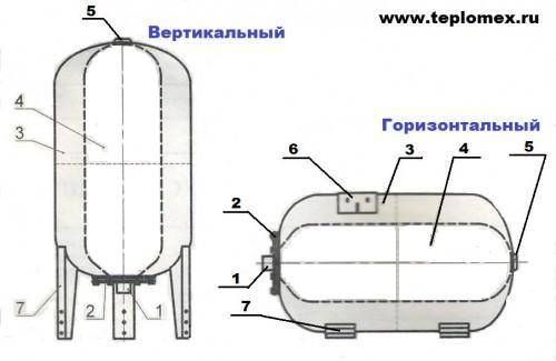 Les modèles horizontaux de petite capacité sont plus souvent utilisés dans les stations de pompage avec une pompe électrique centrifuge de type surface intégrée et des éléments d'un système de contrôle automatique. Les réservoirs hydrauliques à disposition verticale sont utilisés séparément, ils sont plus pratiques à monter lorsque vous travaillez avec des pompes électriques submersibles. Les réservoirs verticaux sont structurellement différents des modèles horizontaux: la coque à membrane est fixée aux parties supérieure et inférieure du corps, en plus du mamelon pour pomper l'air, ils ont un raccord supplémentaire pour le purger de la coque en caoutchouc.