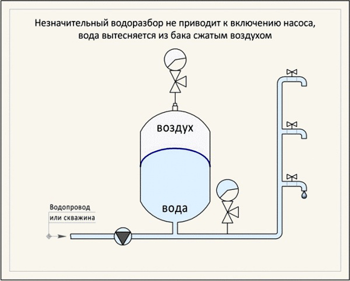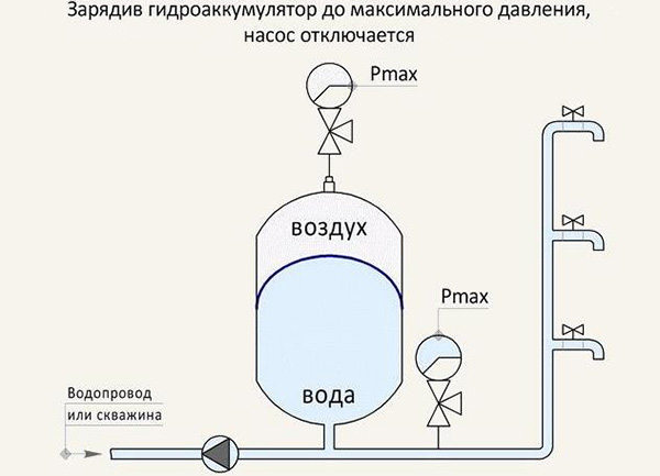 Lorsqu'il y a de l'air à l'intérieur de la structure, la pression nominale est de 1,5 atm. Lorsque l'équipement de pompage est allumé, l'eau est pompée dans le réservoir. Plus le liquide entre, plus l'espace libre du réservoir hydraulique est comprimé.