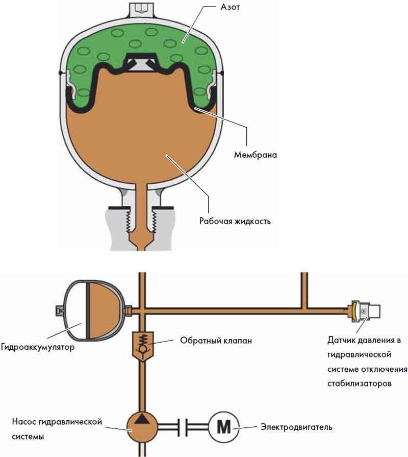 L'accumulateur hydraulique se compose d'un boîtier avec une membrane en caoutchouc, une bride, un mamelon pour pomper de l'air dans la cavité, une vanne de purge d'air, un raccord pour fixer la membrane, etc.