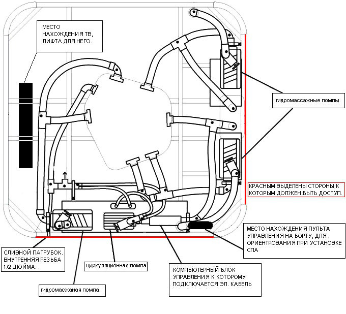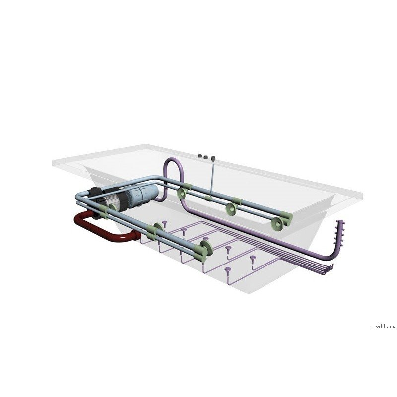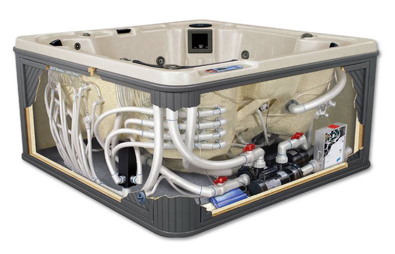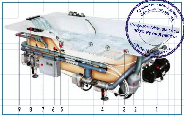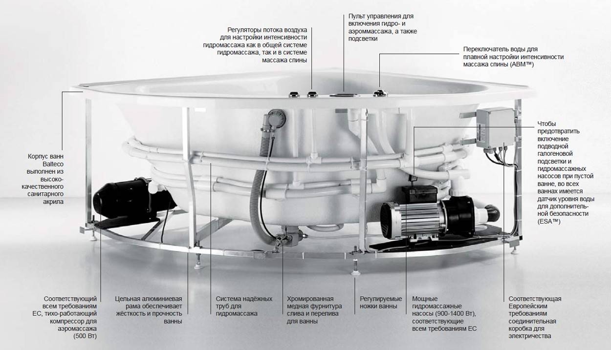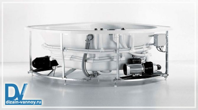 Les principaux éléments structurels d'un tel bain sont le corps et l'équipement qui y est placé. L'unité principale de l'équipement d'hydromassage est une pompe électrique.Il maintient une circulation continue de l'eau, assurant le bon fonctionnement du système.
