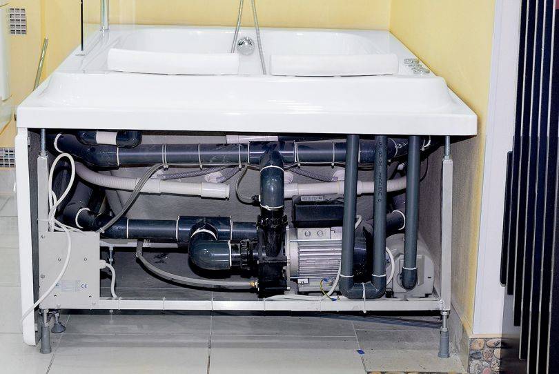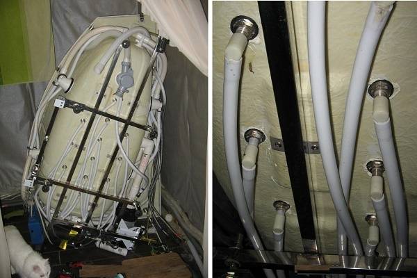 L'équipement d'hydromassage est installé à travers les trous sur les murs et le fond de la salle de bain. Il peut y avoir n'importe quel nombre de buses et chacune d'elles sera connectée au système d'alimentation en eau via un tube et un adaptateur. Pour protéger le système contre les fuites, les joints sont scellés avec du mastic silicone et des joints et raccords supplémentaires.