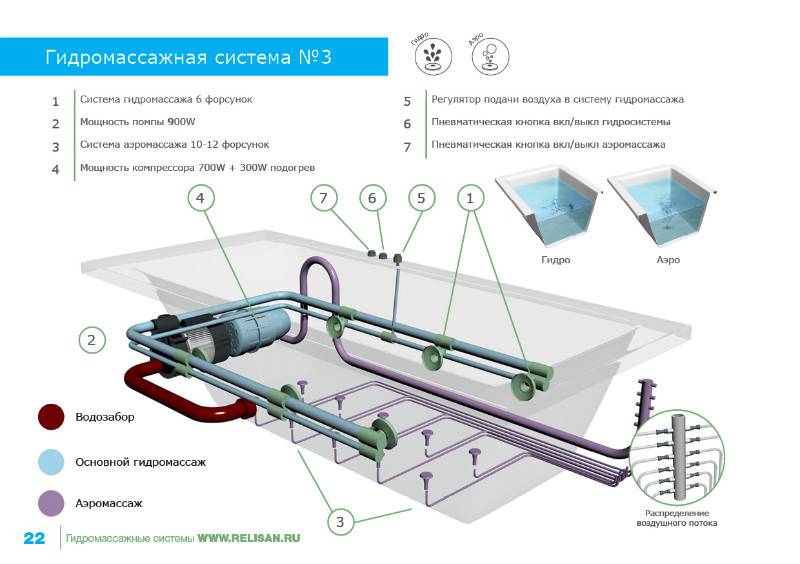 Les modèles d'un appareil plus complexe suggèrent la présence d'un compresseur. Il s'agit d'un dispositif indépendant qui fournit de l'air à travers la conduite d'air à chaque pulvérisateur, qui fonctionne en parallèle avec la pompe. Sous l'action du compresseur, l'air est mélangé aux flux d'eau qui, à travers des trous miniatures découpés dans le fond du bain - des jets sont libérés à l'extérieur.