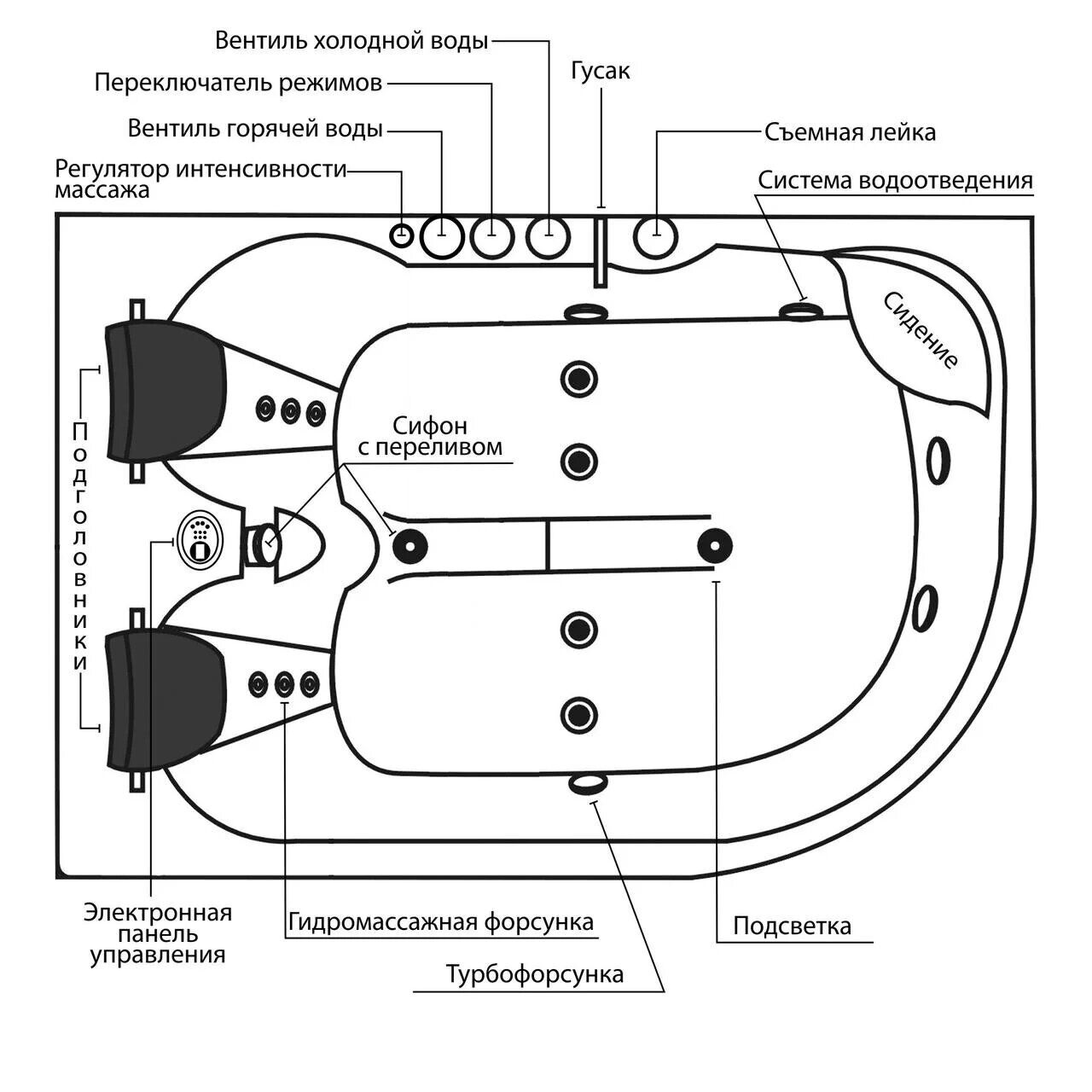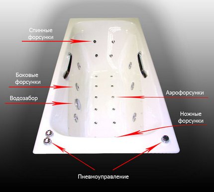 Les buses sont de différents diamètres et peuvent être situées à la fois dans le fond et dans les parois du corps aux endroits où la partie correspondante du corps sera située pendant les procédures d'eau. La taille, le nombre et l'emplacement des buses dépendent du type de modèle et déterminent le niveau d'écrasement des flux d'air.