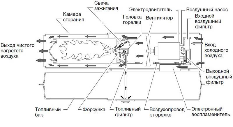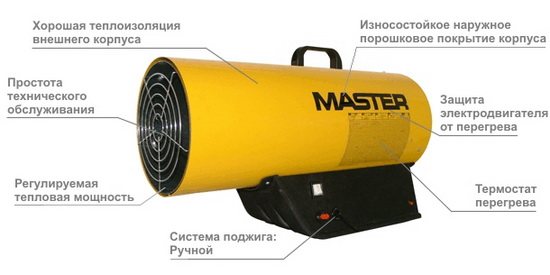 Pour le chauffage de grandes surfaces, ce sont les unités les plus économiques, car consommation de kérosène ou de carburant diesel est d'environ 1 litre par heure, tandis que l'espace peut être chauffé jusqu'à 250 m3.