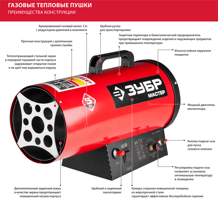 - Le pistolet à gaz peut être utilisé lorsqu'il n'y a personne dans la pièce. L'unité fournit une puissance élevée, un chauffage rapide du garage, des coûts énergétiques minimes.