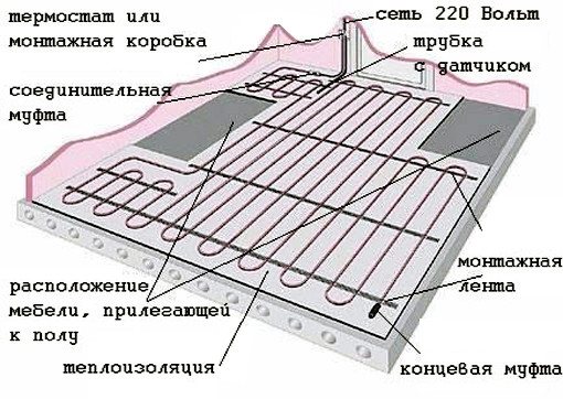 - Nous acceptons la disposition du câble selon le schéma. Nous fixons les accouplements. La première fixation se fait avec un film de montage, empêchant l'étanchéité de se croiser avec le reste du câble. L'extrémité froide du câble doit atteindre le thermostat. De plus, il peut être placé le long du mur, posé entre le mur et l'isolant en feuille.