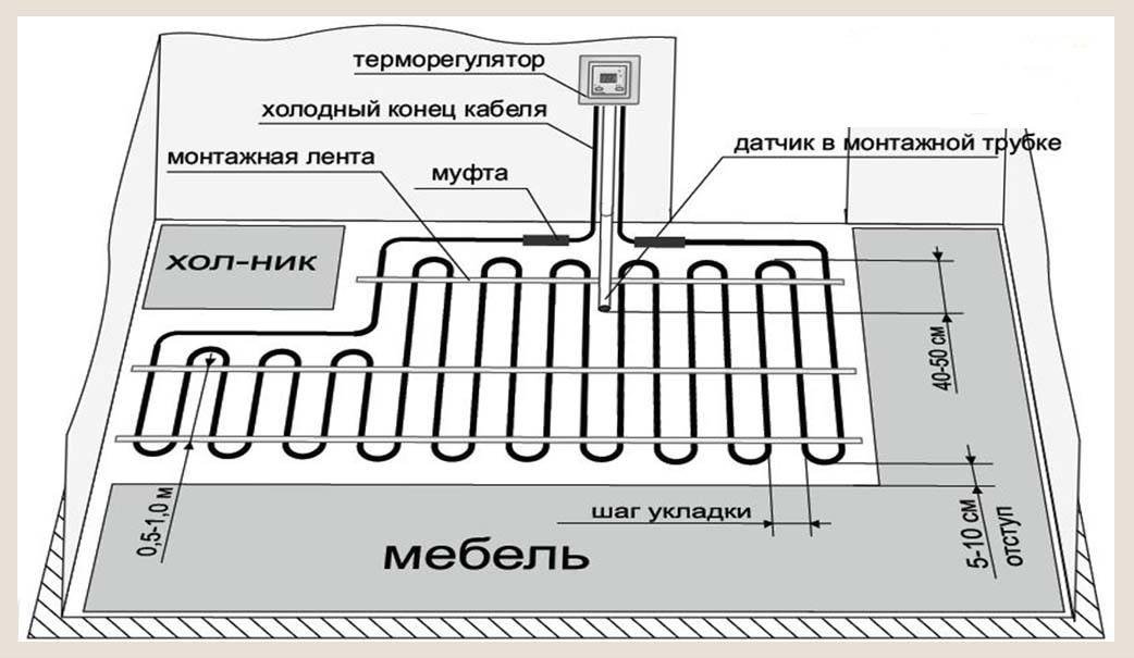 Référence! Avant de procéder à l'installation d'un chauffage au sol par câble sous le carrelage, il est recommandé de faire les calculs précis nécessaires. Dessinez d'abord un schéma de disposition des câbles, puis à l'échelle et sur la base de la pose.
