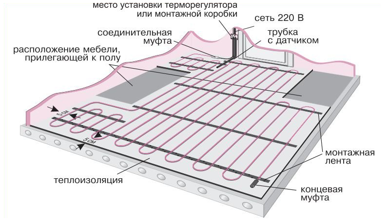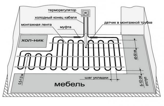 D'ailleurs! Lors du calcul de la quantité de câble requise, il est important de comprendre qu'il ne peut pas être posé sous des meubles fixes. Vous devez également laisser des retraits sur les meubles et les murs de 50 cm et sur les appareils de chauffage (convecteur, colonnes montantes, radiateurs) de 100 cm