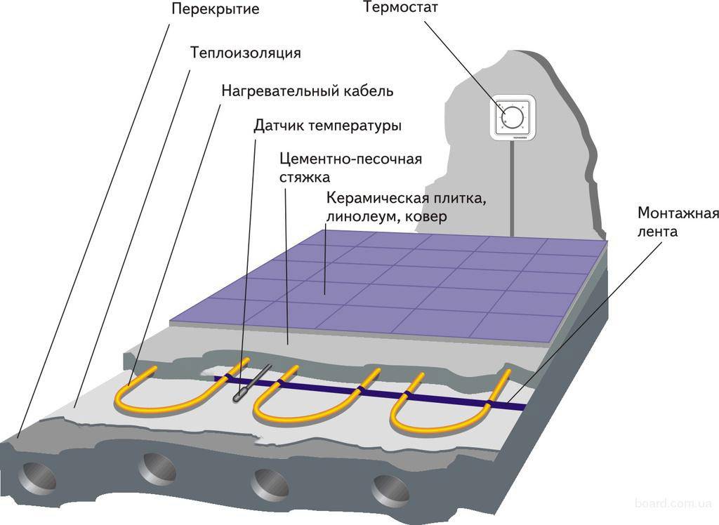 Le système électrique est monté en couches.Tout d'abord, un câble électrique est posé sur le sol, puis une couche d'étanchéité à l'aide d'une composition de revêtement ou d'un matériau en rouleau. La chape en béton se dilate lorsqu'elle est chauffée, de sorte que le matériau du ruban (amortisseur) est posé en dernier autour du périmètre locaux. Etape par étape pour la pose d'un chauffage au sol par câble sous un carrelage :