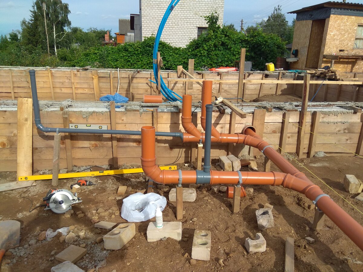 Ces tranchées mènent à un trou dans la fondation, qui a été spécialement laissé pour la sortie du tuyau d'égout.